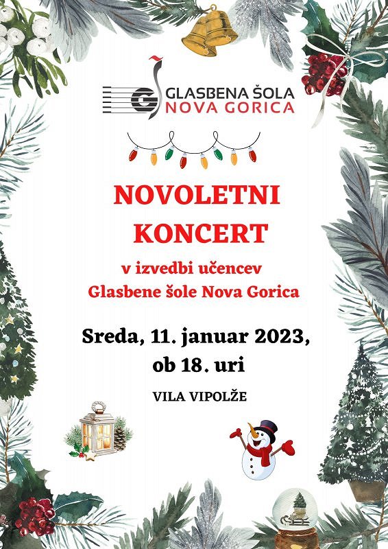 Na novoletnem koncertu v Vili Vipolže, ki bo v sredo 11.1.2023, bodo mladi briški glasbeniki in njihovi glasbeni prijatelji, vsi učenci Glasbene šole Nova Gorica, nastopili solistično, v raznolikih duih in posebnih komornih zasedbah. Ob instrumentalni glasbi, se bo zaslišalo tudi ubrano petje, zaigrala bosta mali godalni in harmonikarski orkester ob spremljavi nekaterih učiteljev.
