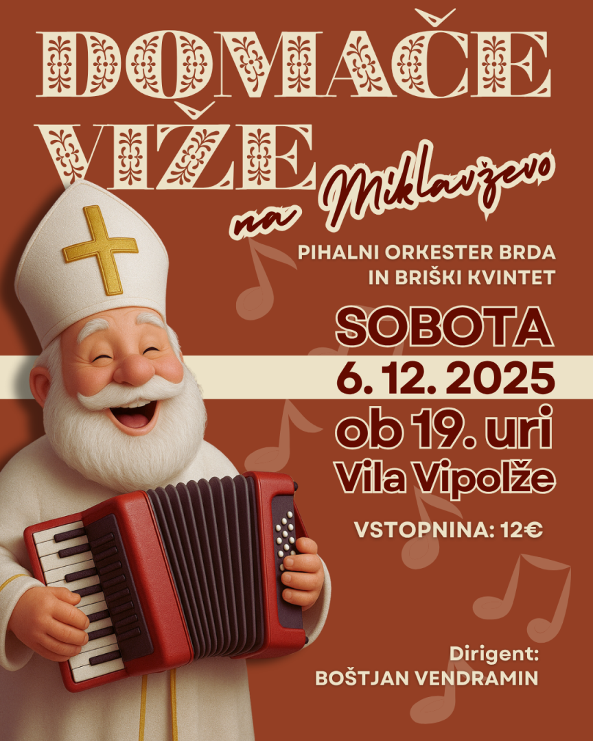 Ko december prižge svojo prvo praznično iskro, se Brda napolnijo z toplino domačih melodij. Na Miklavževo vas ob 19. uri vabimo v Vilo Vipolže, kjer bo večer zadišal po glasbi, druženju in radostnem pričakovanju praznikov.