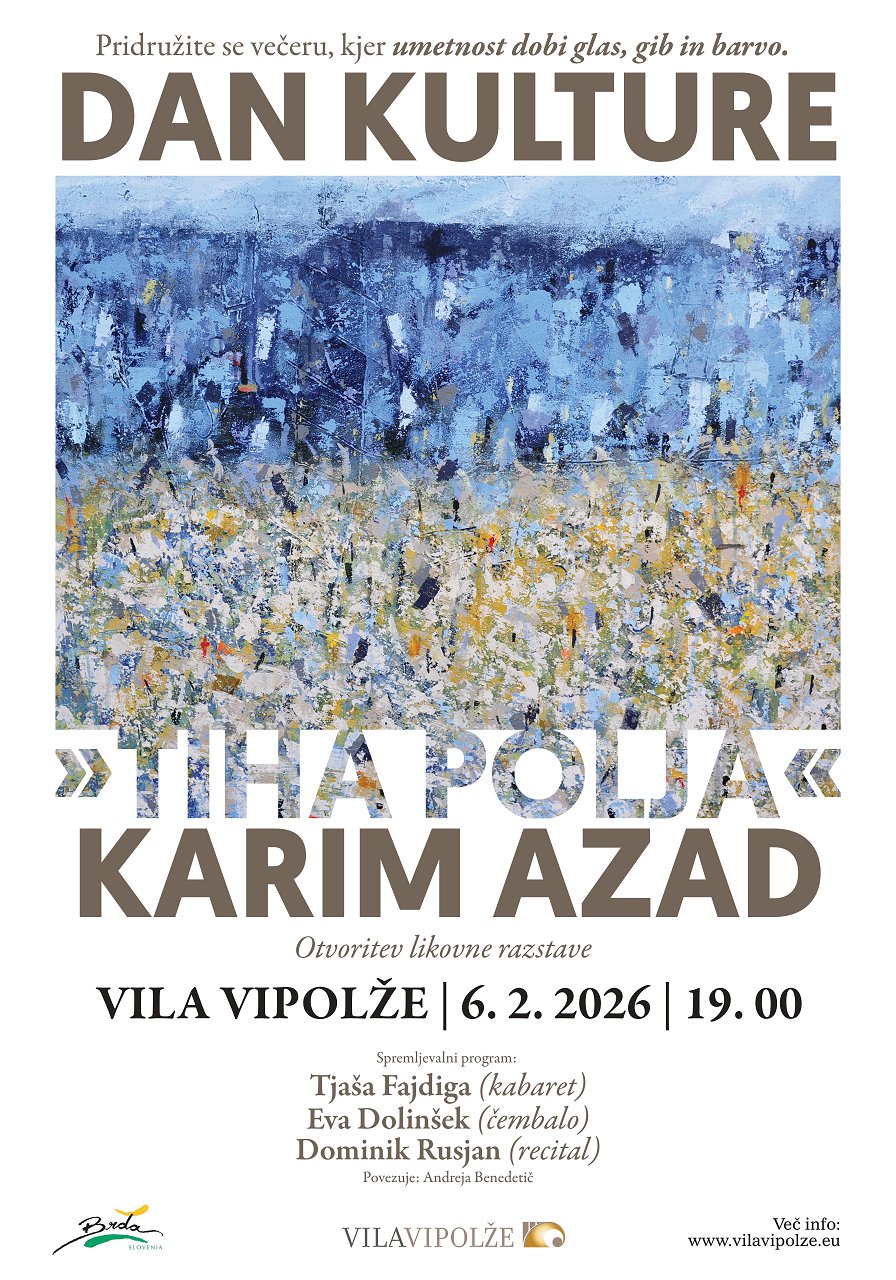 V petek, 6. februarja 2026 ob 19.00, vas vabimo v našo renesančno vilo na poseben večer, posvečen slovenski umetnosti, glasbi in kulturi. Dogodek bo ponudil raznolik program, ki združuje vizualno umetnost, glasbo, literaturo in kabaretno izražanje v prefinjenem kulturnem večeru.
